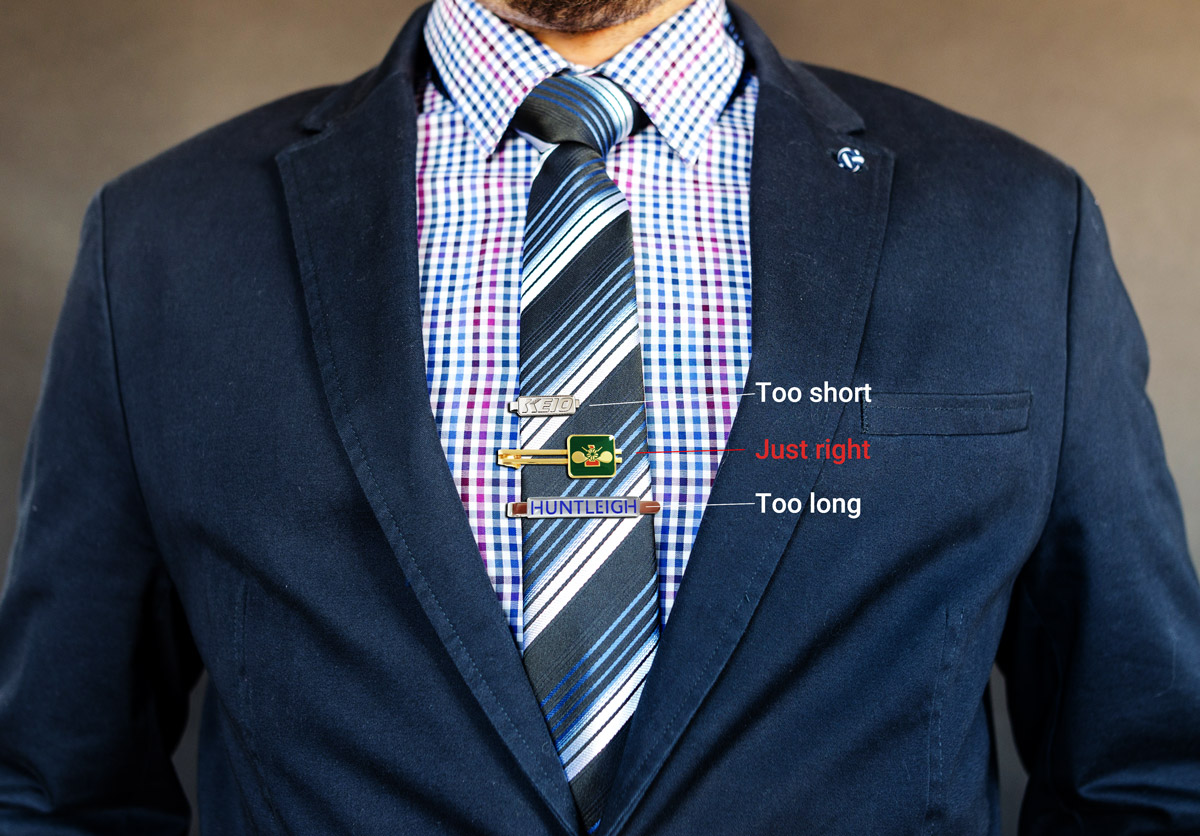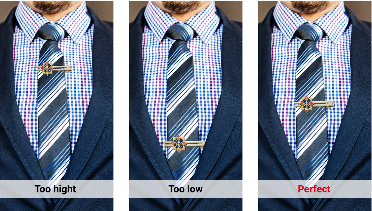When wearing the tie bar, the suitable position is to make the position between the 3rd and 4th buttons of your shirt. Make sure you have fastened both ends to the placket of your shirt.